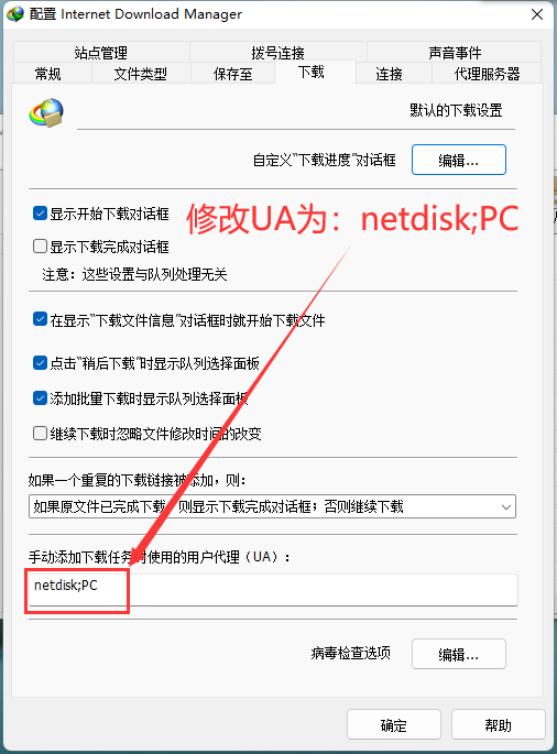 IDM配置:设置4线程及修改UA为 netdisk;PC