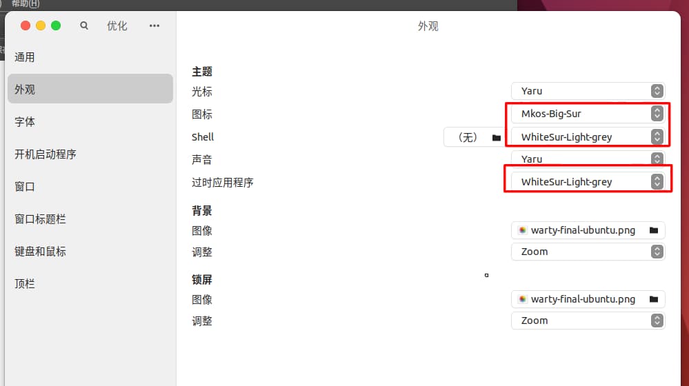搜索打开 tweaks,调整 Icons / 图标、Shell、Legacy Applications / 过时应用程序 三个配置。本文的配置如下: